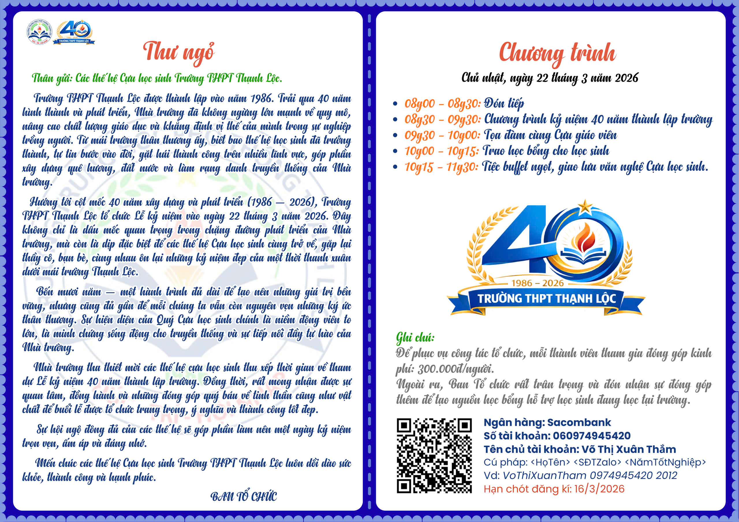 Vào Chủ nhật – ngày 22 tháng 3 năm 2026, Nhà trường trân trọng mời các thế hệ cựu học sinh trở về tham dự Lễ kỷ niệm 40 năm thành lập Trường THPT Thạnh Lộc.